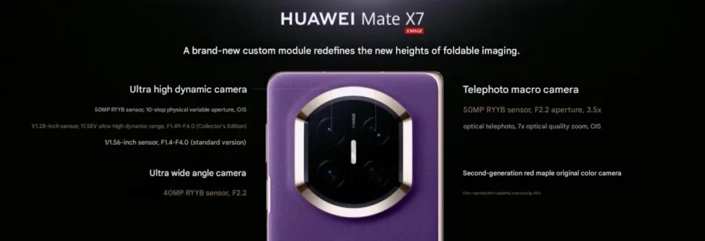 ด้านการถ่ายภาพ, Mate X7 ยังคงใช้กล้องหลักความละเอียด 50MP เช่นเดียวกับปีที่แล้ว พร้อมเซ็นเซอร์ RYYB, รูรับแสงทางกายภาพที่ปรับได้ 10 ระดับ (f/1.4-4.0) และระบบกันสั่น OIS แต่มีการอัปเกรดเซ็นเซอร์ กล้องเทเลโฟโต้ เป็นความละเอียด 50MP พร้อมรูรับแสง f/2.2 ที่กว้างขึ้น และ ซูมแบบออปติคอล 3.5x กล้องตัวที่สามคือ Ultrawide 40MP นอกจากนี้ยังมีกล้องเซลฟี่ 8MP สองตัว ทั้งบนหน้าจอด้านนอกและด้านใน