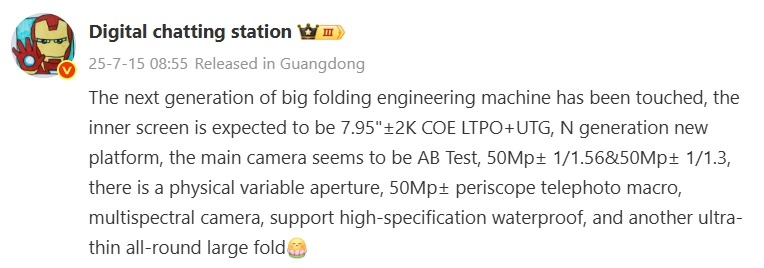 Digital Chat Station แหล่งข่าวหลุดสมาร์ตโฟนได้โพสต์ผ่านบัญชี Weibo ส่วนตัวเผยข้อมูลสเปกของ HUAWEI Mate X7 สมาร์ตโฟนจอพับได้รุ่นใหม่ระบุว่า ต้นแบบทางวิศวกรรมของ Mate X7 มีหน้าจอด้านในขนาดใหญ่ 7.95 นิ้ว ความละเอียด 2K ใช้เทคโนโลยี COE LTPO และกระจกบางเฉียบ (UTG) ซึ่งน่าจะช่วยเพิ่มประสิทธิภาพการแสดงผลและความทนทาน