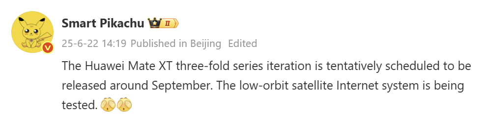 Smart Pikachu แหล่งข่าวหลุดสมาร์ตโฟนเผยผ่านบัญชี Weibo ส่วนตัวระบุว่า HUAWEI Mate XT 2 จะเปิดตัวในเดือนกันยายนที่ประเทศจีน เขากล่าวเสริมว่ากำลังอยู่ระหว่างการทดสอบภายในโดยรองรับการเชื่อมต่อสื่อสารผ่านดาวเทียม ซึ่งมีแนวโน้มว่าจะใช้กับฟีเจอร์เช่น การส่งข้อความฉุกเฉินหรือการเข้าถึงอินเทอร์เน็ตพื้นฐานในพื้นที่ห่างไกล คล้ายกับสิ่งที่เคยเห็นในสมาร์ตโฟนเรือธงของ HUAWEI รุ่นล่าสุดและอุปกรณ์ Apple บางรุ่น