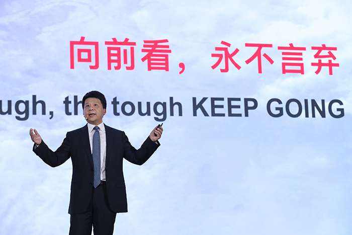 นายกัว ผิง ประธานกรรมการบริหารหมุนเวียนตามวาระของหัวเว่ย ขึ้นกล่าวสุนทรพจน์