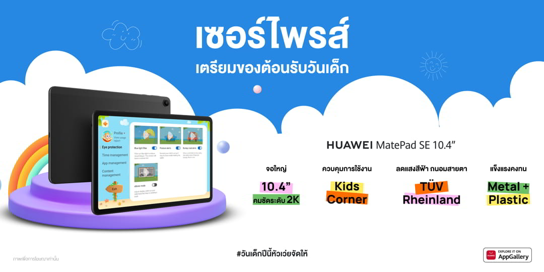 เริ่มด้วย HUAWEI MatePad SE 10.4” แท็บเล็ตหน้าจอใหญ่ระดับ 2K เสมือนเพื่อนคู่ใจลูกน้อยช่วยเสริมสร้างทักษะการเรียนรู้และจิตนาการได้อย่างไม่มีที่สิ้นสุด ผู้ปกครองสามารถวางใจกับโหมดช่วยดูแลการใช้งานแท็บเล็ตอย่างเหมาะสมผ่าน Kids Corner