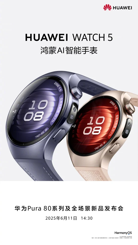 HUAWEI ปล่อยทีเซอร์ประกาศเตรียมเปิดตัว HUAWEI Pura 80 Series และอุปกรณ์อัจฉริยะหลายรุ่น รวมถึง HUAWEI Watch 5 จะเปิดตัวที่ประเทศจีนในวันที่ 11 มิถุนายน โดยการประกาศดังกล่าวได้แชร์ผ่านบัญชี Weibo อย่างเป็นทางการของ HUAWEI