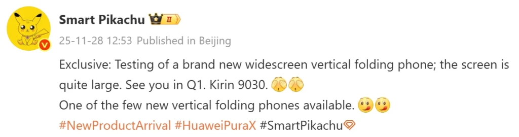 แหล่งข่าวชื่อดัง Smart Pikachu ได้ออกมาเปิดเผยข้อมูลว่า HUAWEI กำลังซุ่มพัฒนามือถือจอพับแนวกว้าง (Widescreen vertical foldable phone) รุ่นใหม่อยู่ ซึ่งคาดว่าจะเปิดตัวในช่วง ไตรมาสที่ 1 ของปี 2026 (Q1 2026)