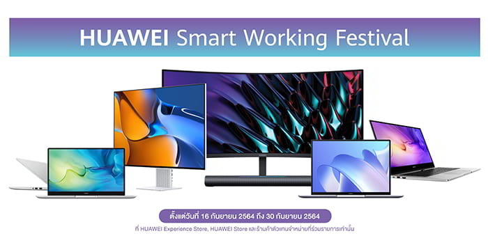 ยิ่งไปกว่านั้นยังสามารถใช้งาน HUAWEI M-Pencil 2nd generation จดโน้ตลงใน HUAWEI MatePad Pro 12.6” ได้อย่างสะดวกสบายและไหลลื่นอีกด้วยไม่ว่าจะจับคู่อุปกรณ์ไหนจากไลน์อัพสินค้าในเทศกาล HUAWEI Smart Working Festival ก็ตอบโจทย์ทั้งการใช้ทำงาน เรียนหนังสือ หรือเล่นเกมคลายเครียดก็สมาร์ทและคล่องตัวได้ทุกรูปแบบ หากใครที่กำลังมองหาจอมอนิเตอร์หรือแล็ปท็อปเครื่องใหม่ ทางหัวเว่ยได้ปล่อยโปรโมชันสุดจี๊ดที่เห็นแล้วต้องรีบเอฟด่วนๆ กับดีลสุดพิเศษตามรายละเอียดด้านล่างนี้ เมื่อซื้อสินค้าระหว่างวันที่ 16 กันยายน 2564 – 30 กันยายน 2564 เท่านั้น ที่ HUAWEI Experience Store, HUAWEI Store และร้านค้าที่ร่วมรายการเท่านั้น โดยสามารถดูรายละเอียดเพิ่มเติมได้และผ่านช่องทางออนไลน์แพลตฟอร์มต่างๆ ทั้ง เฟซบุ๊กเพจ Huawei Mobile TH | Line | | Lazada