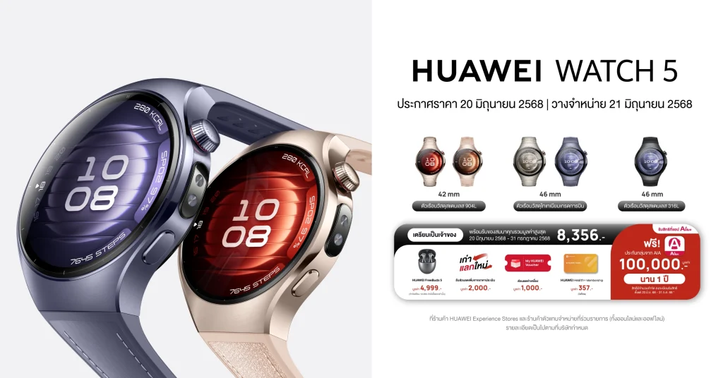 HUAWEI WATCH 5 เตรียมประกาศราคาไทยในวันที่ 20 มิถุนายน 2568 มอบประสบการณ์สมาร์ทวอชระดับเรือธงกับราคาที่คุ้มค่ากว่าระดับโลก พร้อมข้อเสนอรับของสมนาคุณรวมมูลค่าสูงสุด 8,356 บาท ตั้งแต่วันที่ 20 มิถุนายน 2568 – 31 กรกฏาคม 2568
