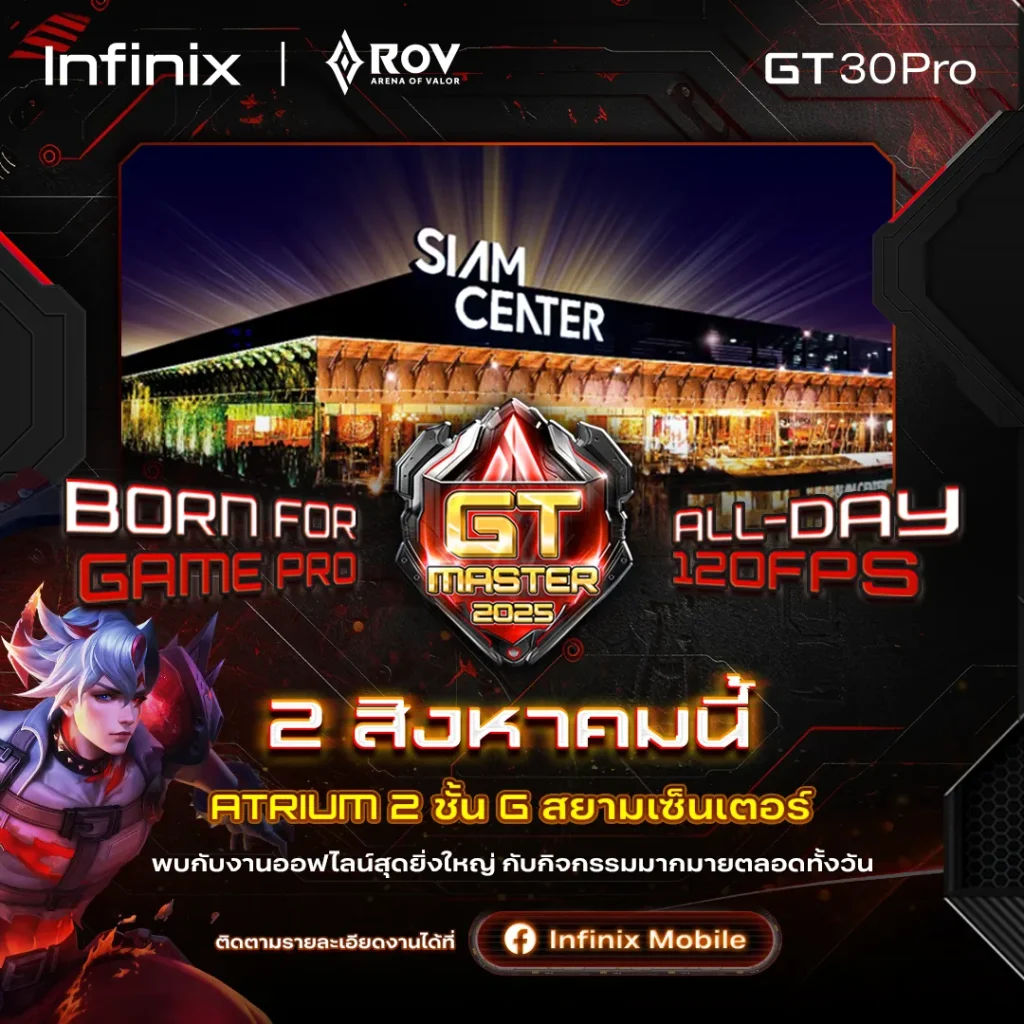 Infinix (อินฟินิกซ์) แบรนด์สมาร์ทโฟนคุ้มค่าคุ้มราคา ครบครันทุกการใช้งาน ตอบโจทย์ไลฟ์สไตล์คนรุ่นใหม่ เตรียมเสิร์ฟความสนุกแบบจัดเต็มในงาน Infinix GT Master 2025 การแข่งขันทัวร์นาเมนต์ RoV ที่เดินทางมาถึงรอบตัดสิน