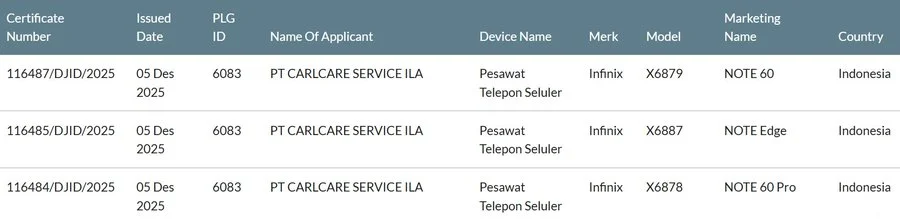 ล่าสุด พบความเคลื่อนไหวครั้งใหม่ในฐานข้อมูลของ SDPPI ประเทศอินโดนีเซีย ซึ่งเผยให้เห็นรายชื่อสมาร์ตโฟน 3 รุ่นใหม่ในตระกูล Note Series ที่ผ่านการรับรองมาตรฐานเป็นที่เรียบร้อย พร้อมระบุชื่อรุ่นและหมายเลขโมเดลอย่างชัดเจน ดังนี้: