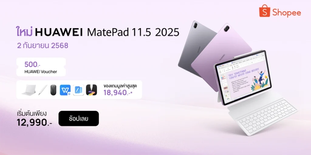 แคมเปญสุดพิเศษสำหรับสายทำงานและสายเรียนที่กำลังมองหาแท็บเล็ตคุณภาพสูง ครบเครื่องการใช้งานในราคาสบายกระเป๋า กับ HUAWEI MatePad 11.5” 2025 ที่ Shopee ในราคาเริ่มต้นเพียง 12,990 บาท พร้อมโค้ดส่วนลดจากหัวเว่ยมูลค่า 500 บาท* และรับของแถมจัดเต็มมูลค่ากว่า 18,940 บาท ในวันที่ 2 กันยายน 2568 นี้!
