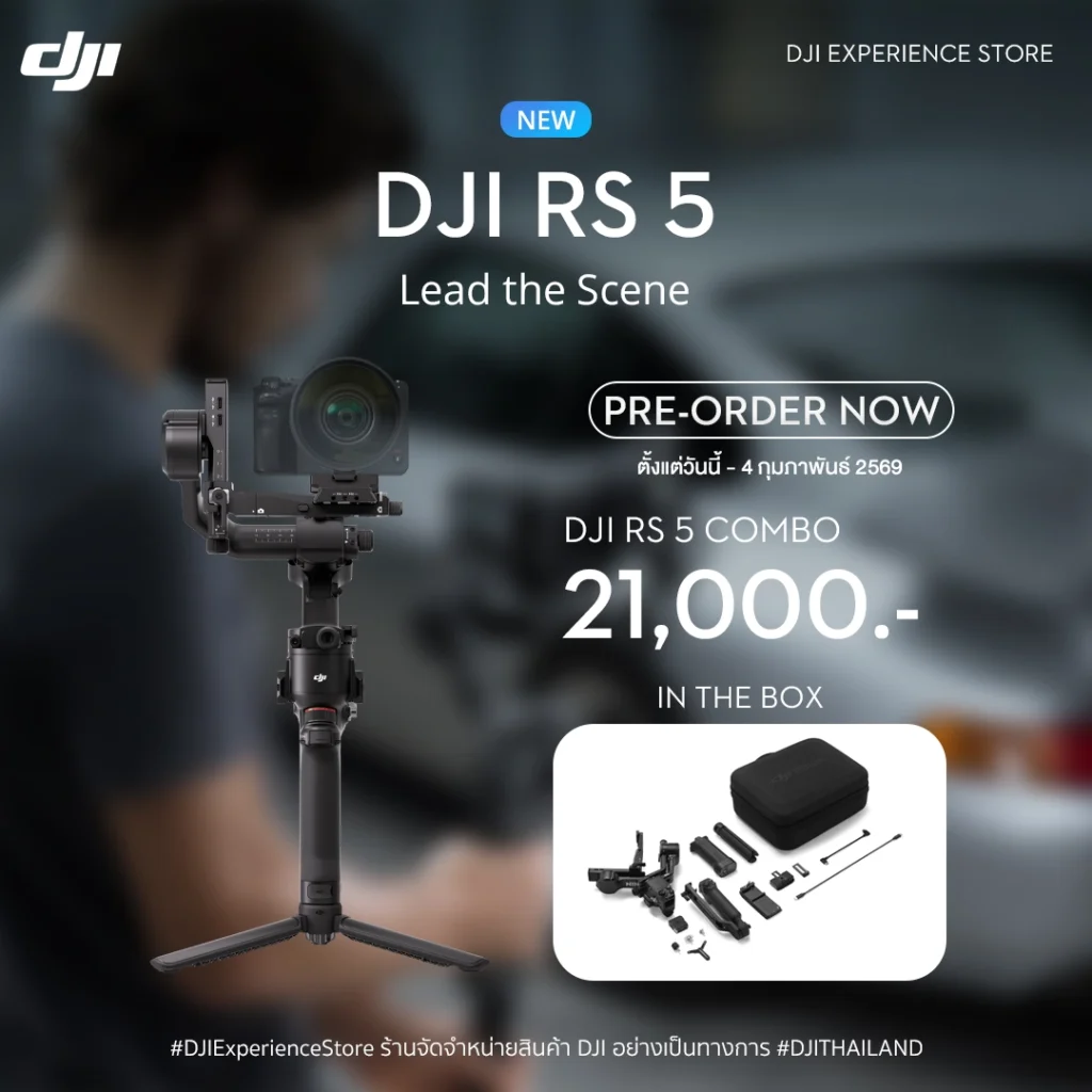 DJI RS 5 พร้อมให้สั่งซื้อตั้งแต่ 29 มกราคม 2569 ที่ DJI Expereince Store และพาร์ทเนอร์ค้าปลีกที่ได้รับอนุญาต โดยเริ่มจำหน่ายตั้งแต่วันนี้ในรูปแบบต่อไปนี้: