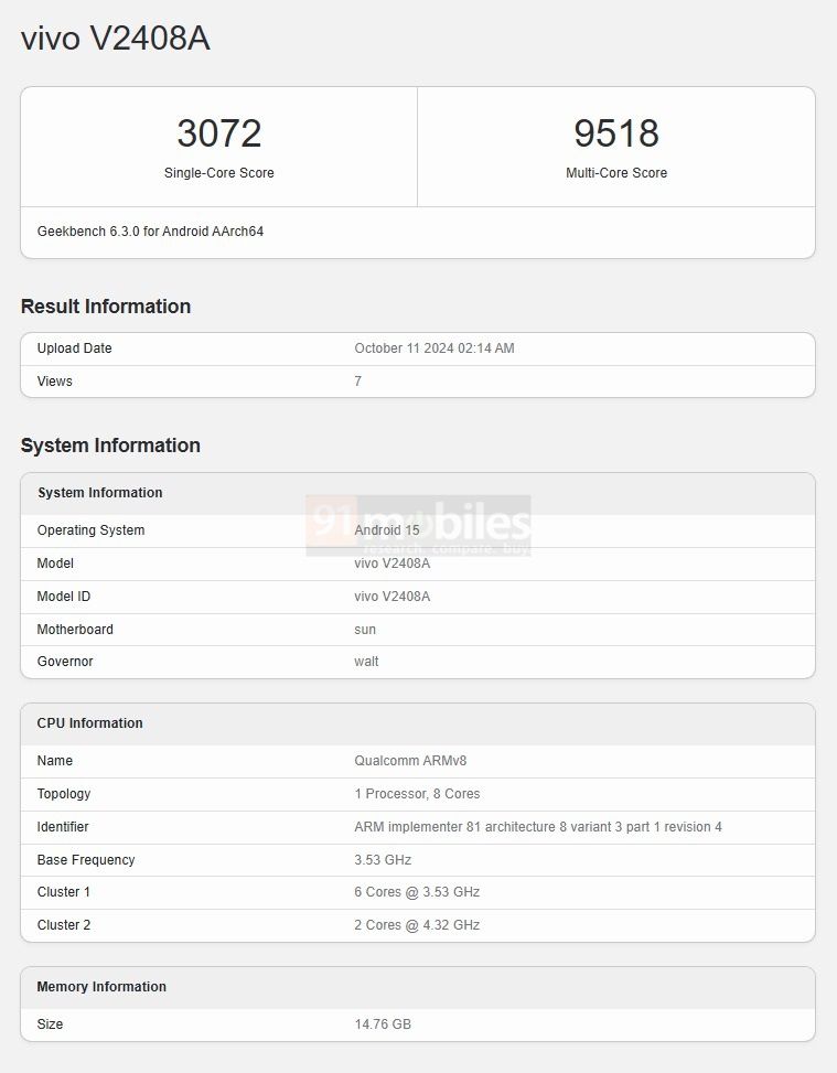 สำหรับสเปกของ vivo หมายเลขรุ่น V2408A หรือ iQOO 13 ที่ปรากฎบนแอป GeekBench 6.3.0 ใช้หน่วยประมวลผลซีพียูแบบ Octa Core ความเร็ว 3.53GHz ประกอบด้วยซีพียูหกคอร์ที่ 3.53GHz และซีพียูสองคอร์ที่ 4.32GHz