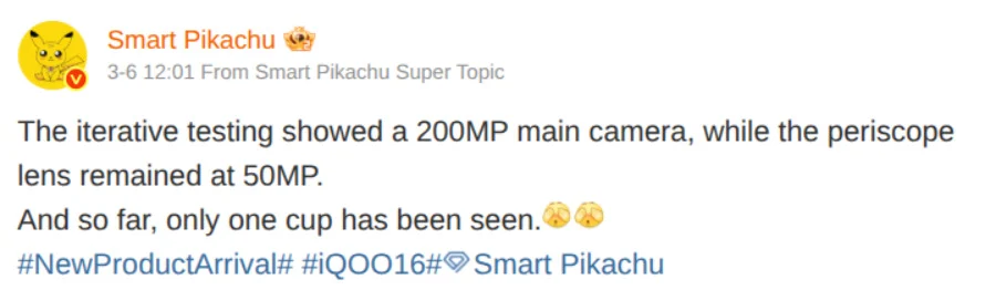 ข้อมูลจาก Smart Pikachu แหล่งข่าวหลุดชื่อดังบน Weibo เปิดเผยว่า ขณะนี้ iQOO 16 กำลังอยู่ในขั้นตอนการทดสอบใช้งาน กล้องหลักความละเอียด 200MP (200 ล้านพิกเซล) ซึ่งถือเป็นการเปลี่ยนแปลงที่สำคัญเมื่อเทียบกับ iQOO 15 รุ่นปัจจุบันที่ใช้เซนเซอร์หลัก 50MP