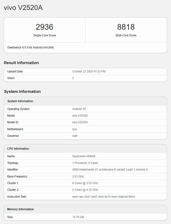 แม้ว่าในรายการ Geekbench จะไม่ได้ระบุชื่อชิปเซ็ตที่ขับเคลื่อน iQOO Neo 11 โดยตรง แต่รายละเอียดของ CPU และ GPU (จากซอร์สโค้ด) ก็เพียงพอที่จะยืนยันได้ว่ามันมาพร้อมกับชิปเซ็ต Snapdragon 8 Elite