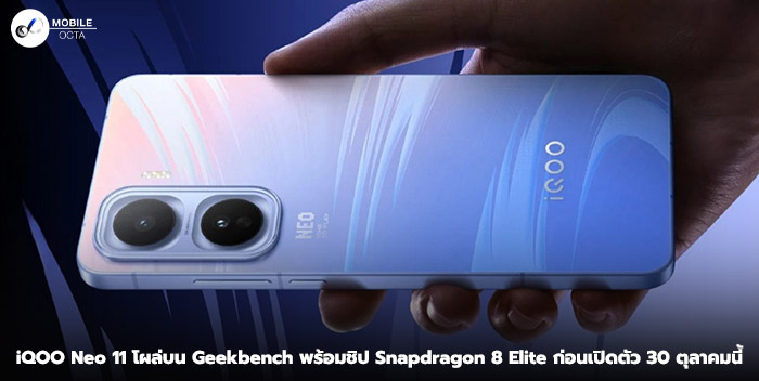 iQOO Neo 11 มีกำหนดเปิดตัวอย่างเป็นทางการในวันที่ 30 ตุลาคมนี้ที่ประเทศจีน ล่าสุด สมาร์ตโฟนเรือธงราคาย่อมเยารุ่นนี้ได้ปรากฏตัวบนแพลตฟอร์ม Geekbench เผยรายละเอียดสำคัญเกี่ยวกับชิปเซ็ต, RAM และระบบปฏิบัติการ