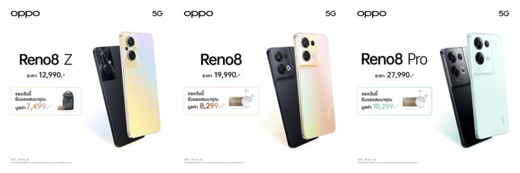 เปิดตัวพร้อมกัน 3 รุ่น ได้แก่ OPPO Reno8 Z 5G ราคา 12,990 บาท, OPPO Reno8 5G ราคา 19,990 บาท และ OPPO Reno8 Pro 5G ราคา 27,990 บาท และพิเศษ! เป็นเจ้าของ OPPO Reno8 Series 5G ได้ง่ายยิ่งขึ้น เมื่อจองผ่านผู้ให้บริการเครือข่าย ราคาเริ่มต้นเพียง 4,490 บาท