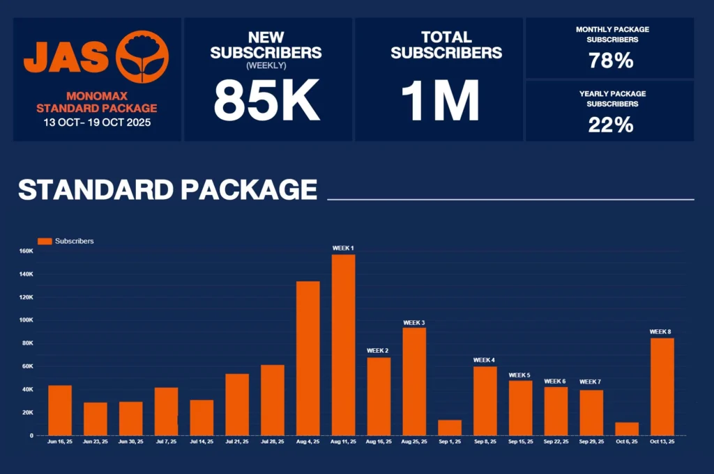 ตอนนี้มียอดผู้ชมการแข่งขันฟุตบอลมากกว่า 1 ล้านรายแล้ว โดยเป็นยอดสมาชิกจากแพ็กเกจ Monomax Standard ซึ่งการเติบโตของสมาชิก Monomax