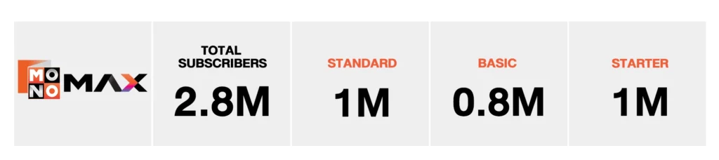 โดยภาพรวมฐานสมาชิกทั้งหมดของ Monomax ปัจจุบันมีมากกว่า 2.8 ล้านราย โดยแบ่งเป็นแพ็กเกจ Standard กว่า 1 ล้านราย, แพ็กเกจ Basic 8 แสนราย และแพ็กเกจ Starter 1 ล้านราย MONO ยังคงเดินหน้าเสริมทัพคอนเทนต์ระดับโลกอย่างต่อเนื่อง
