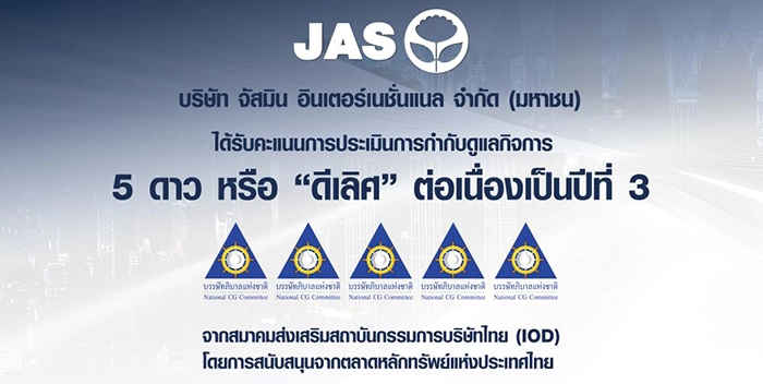 ล่าสุด JAS ได้รับการประเมินตามโครงการสำรวจการกำกับดูแลกิจการบริษัทจดทะเบียน ประจำปี 2568 (CGR 2025) อยู่ในระดับ “ดีเลิศ (Excellent)” หรือ 5 ดาว ต่อเนื่องเป็นปีที่ 3