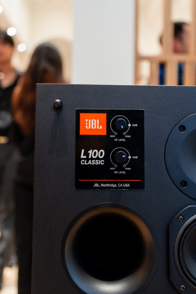 ลำโพง JBL L100 ที่โดดเด่นด้วยดีไซน์ยุคทองของเครื่องเสียง และเทคโนโลยีเสียงสมัยใหม่ ถ่ายทอดเสียงเพลงด้วยรายละเอียดที่มีมิติ ช่วยเติมเต็มความประณีตของงานเปิดตัวคอลเลคชันใหม่ได้อย่างสมบูรณ์แบบ