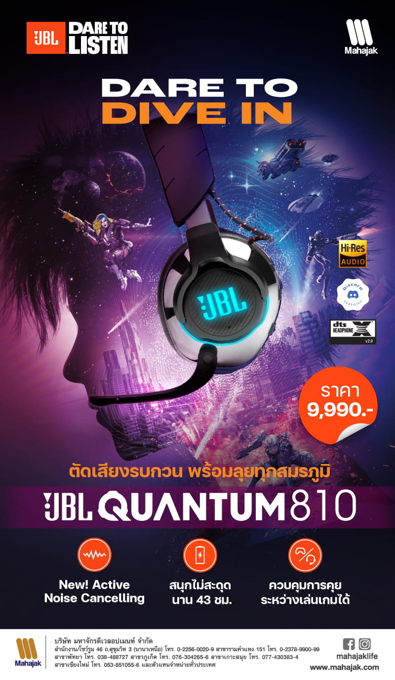 ยกระดับการเล่นเกมให้สมจริงที่สุดด้วย JBL Quantum 810 Wireless หูฟังเกมมิ่งแบบไร้สายดีไซน์เท่สวมใส่สบาย มีระบบ Active Noise Cancelling ยกระดับการเล่นเกมด้วย ระบบตัดเสียงรบกวนรอบข้าง ให้เสียงสมจริงรอบทิศทางคุณภาพสูงแบบ Hi-res สนทนาคมชัดรับรองโดย Discord-certified ใช้งานได้นานถึง 43 ชั่วโมง มันส์ได้อย่างต่อเนื่อง ชาร์จไปเล่นไปได้อย่างไม่สิ้นสุด