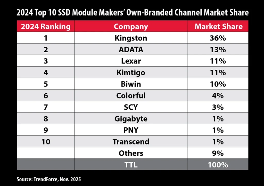 Kingston Technology ผู้นำด้านผลิตภัณฑ์หน่วยความจำและโซลูชันเทคโนโลยีระดับโลก ประกาศว่าได้รับการจัดอันดับจาก TrendForce ให้เป็นผู้นำอันดับหนึ่งสำหรับการเป็นซัพพลายเออร์ประเภทบุคคลที่สามด้านการจัดส่ง Channel SSD ในปี 2567 โดยอ้างอิงจากข้อมูลของ TrendForce ระบุว่า Kingston ครองส่วนแบ่งตลาดในการจัดส่งสูงถึง 36% ของจำนวนยูนิตทั้งหมดทั่วโลกในปีดังกล่าว