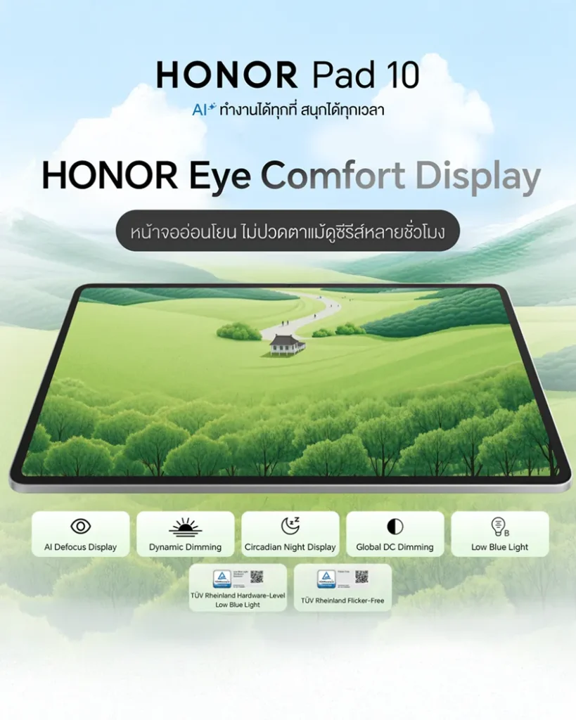 เพื่อการใช้งานที่สบายตาแท็บเล็ตรุ่นนี้มาพร้อม HONOR Eye Protection ผ่านการรับรองจาก TÜV Rheinland ทั้ง Low Blue Light (โซลูชันฮาร์ดแวร์) และ Flicker Free Eye Comfort ช่วยลดแสงสีฟ้าและการกระพริบของหน้าจอ ลดความเมื่อยล้าของสายตา