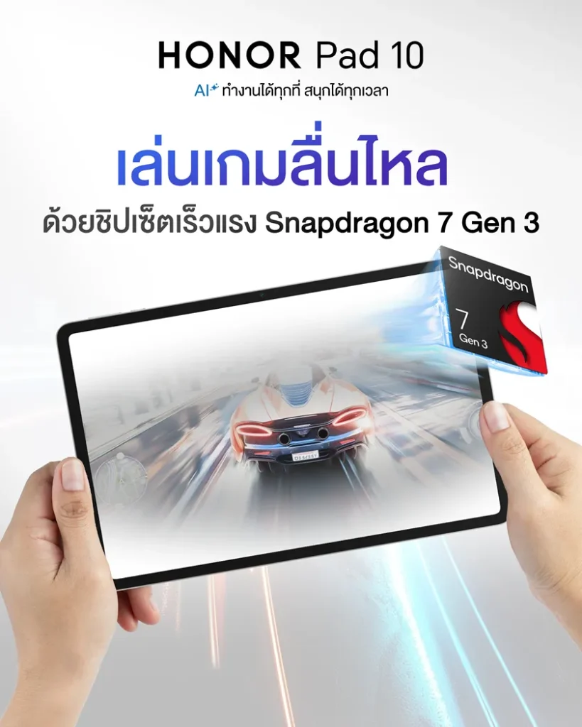 HONOR Pad 10 ขับเคลื่อนด้วย Qualcomm Snapdragon® 7 Gen 3 Mobile Platform ที่ผลิตบนสถาปัตยกรรมขนาด 4nm โดย TSMC มอบพลังการประมวลผลที่เหนือระดับและเสถียรยิ่งขึ้น ประสิทธิภาพได้รับการยกระดับอย่างเต็มที่ทั้ง GPU ที่เร็วขึ้นถึง 50%, CPU ที่แรงขึ้น 15%