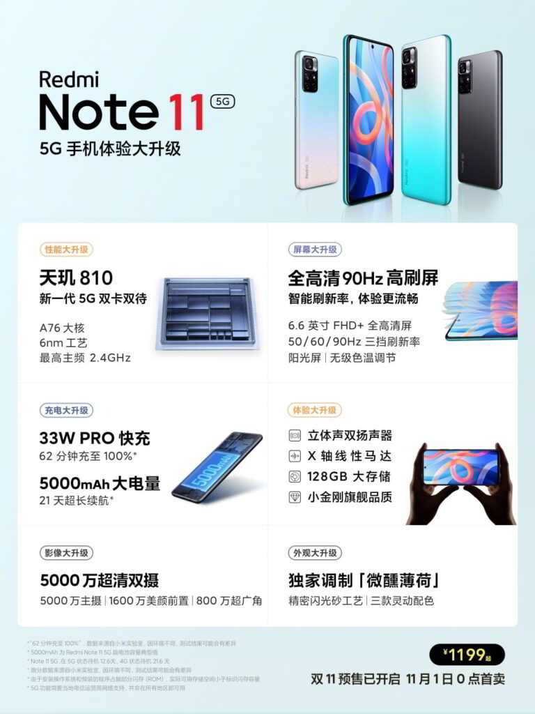 ทั้งนี้ Redmi Note 11 มีให้เลือก 3 สีคือ Mysterious Black, Milky Way Blue และ Mint Green โดยจะวางจำหน่ายที่ประเทศจีน 1 พฤศจิกายน 2021 ส่วนราคามีดังนี้