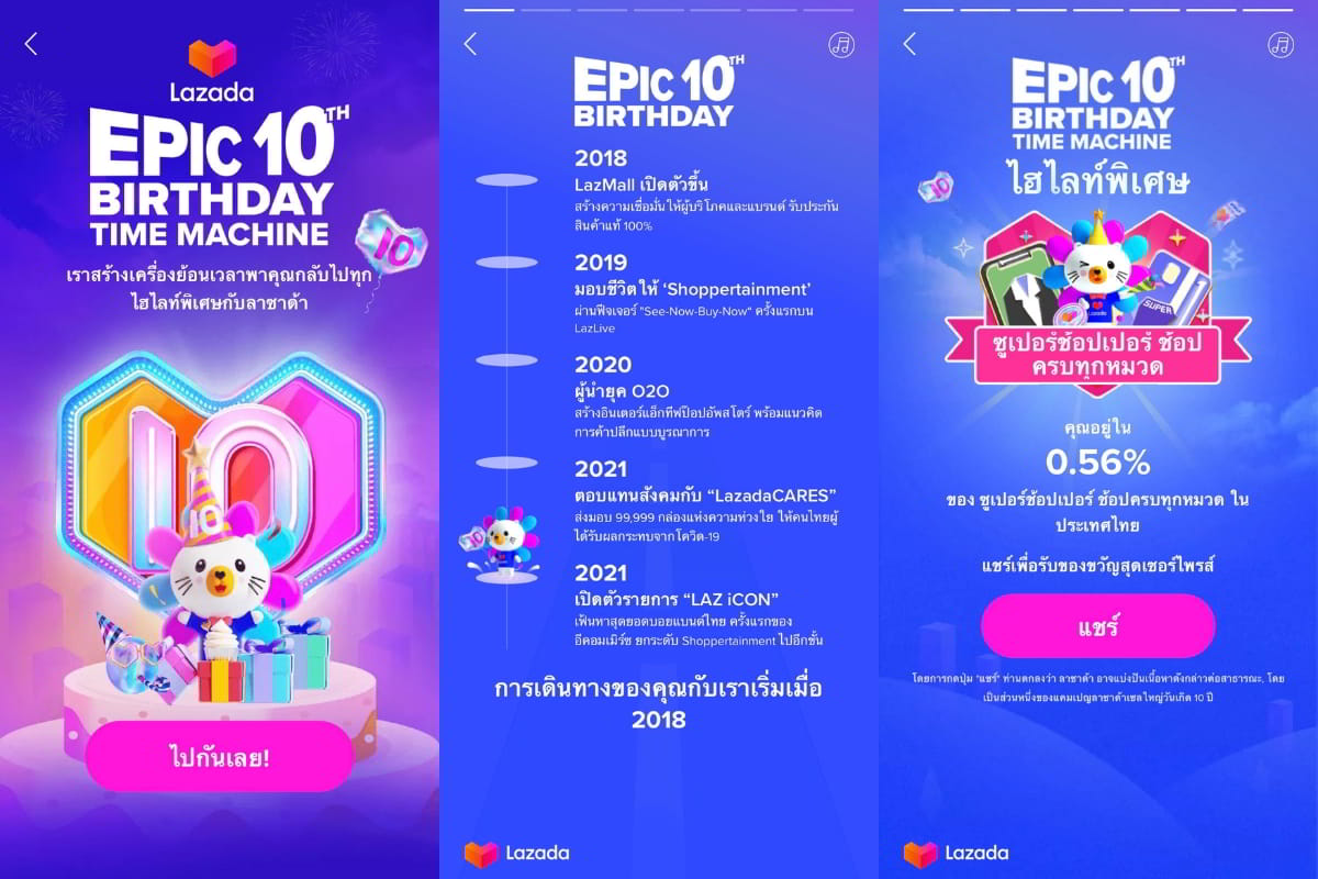 ลาซาด้า ยังจัดแคมเปญออนไลน์ #ShareYourEpic ให้นักช้อปชาวไทย อินโดนีเซีย มาเลเซีย ฟิลิปปินส์ และสิงคโปร์ ได้ร่วมสนุกกับเทศกาลวันเกิดครบรอบ 10 ปี ของลาซาด้วยกันทั้งภูมิภาค สำหรับในประเทศไทย เหล่านักช้อปสามารถร่วมสนุกได้โดยการแชร์ไอเดียฉลองวันเกิดสุดปังลงบนอินสตาแกรมรีล เฟซบุ๊ก และติ๊กต๊อก ตั้งแต่วันนี้ถึง 27 มีนาคม 2565 เพื่อลุ้นรับเงินรางวัล 100,000 บาท