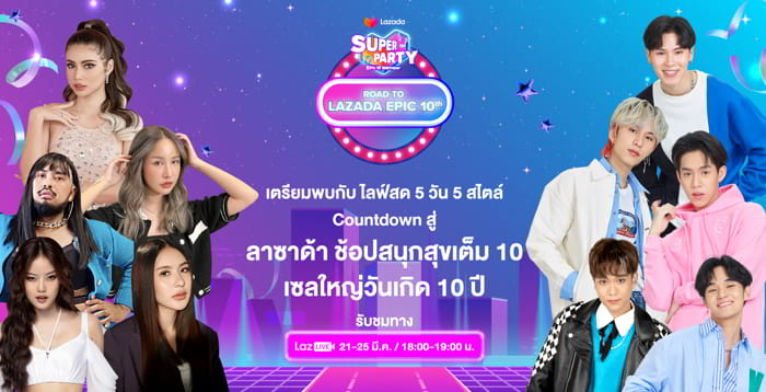เตรียมพบการเฉลิมฉลองสุดยิ่งใหญ่ที่ไม่เคยเกิดขึ้นที่ไหนมาก่อน ครั้งแรกกับ Lazada EPIC 10th Birthday Super Party ฉลองวันเกิด 10 ปีลาซาด้า ที่ยกกองทัพศิลปินดาราชื่อดังมากมาย มาพร้อมกับโชว์พิเศษสุดปังสำหรับงานนี้เท่านั้น อาทิ ลาซาด้าแบรนด์แอมบาสเดอร์ อย่าง เบลล่า-ราณี, ใบเฟิร์น-พิมพ์ชนก, มาริโอ้ เมาเร่อ, บิวกิ้น-พุฒิพงศ์, พีพี-กฤษฏ์, ไบร์ท-วชิรวิชญ์, วิน-เมธวิน, และหนุ่มๆ ผู้ชนะ จากรายการ LAZ iCON