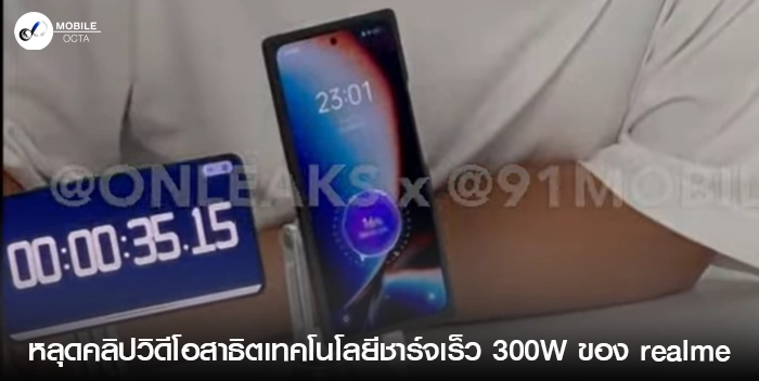 คลิปวิดีโอสาธิตเทคโนโลยีชาร์จเร็ว 300W ของ realme ที่หลุดออกมาแสดงให้เห็นว่า สมาร์ตโฟนสามารถชาร์จแบตเตอรี่จาก 0% ได้ถึง 8% ภายในเวลา 20 วินาที, 15% ภายในเวลา 32 วินาที และชาร์จถึง 17% ภายในเวลาเพียง 35 วินาที