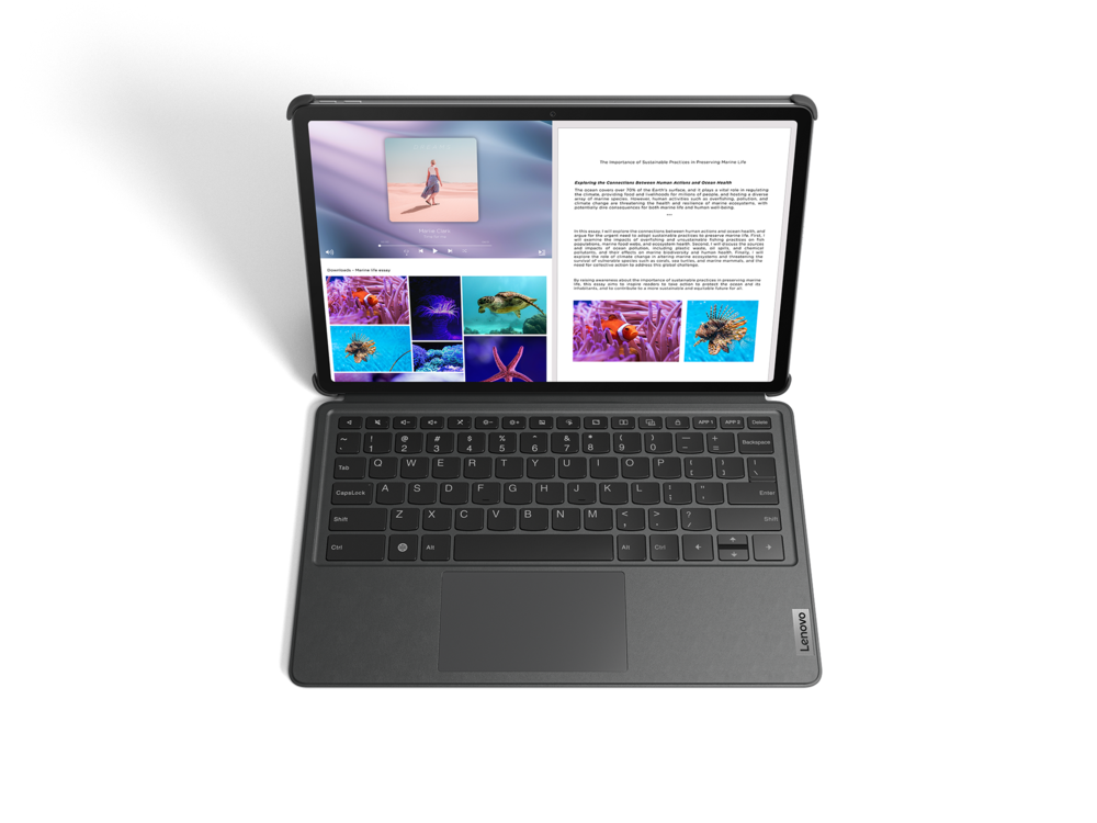 ซึ่งมอบประสบการณ์การใช้งานที่ลื่นไหลเมื่อเชื่อมต่อและใช้งานร่วมกับ PC สลับจากความบันเทิงมาใช้งานในการพิมพ์ก็สามารถทำได้อย่างรวดเร็วเพียงต่อแผงคีย์บอร์ด Lenovo Keyboard Pack ที่ได้รับแรงบันดาลใจในการออกแบบมาจากคีย์บอร์ด ThinkPad ระยะปุ่มกด key travel ขนาด 1.5 มิลลิเมตร ความโค้งปุ่ม 0.2 มิลลิเมตร คีย์ พิช 19 มิลลิเมตร เพื่อการพิมพ์ที่สบายมือ แทรคแพดที่มาพร้อมคีย์บอร์ดมีเมนูลัดถึง 16 เมนูเพื่อเสริมการใช้งานที่สะดวกยิ่งขึ้น