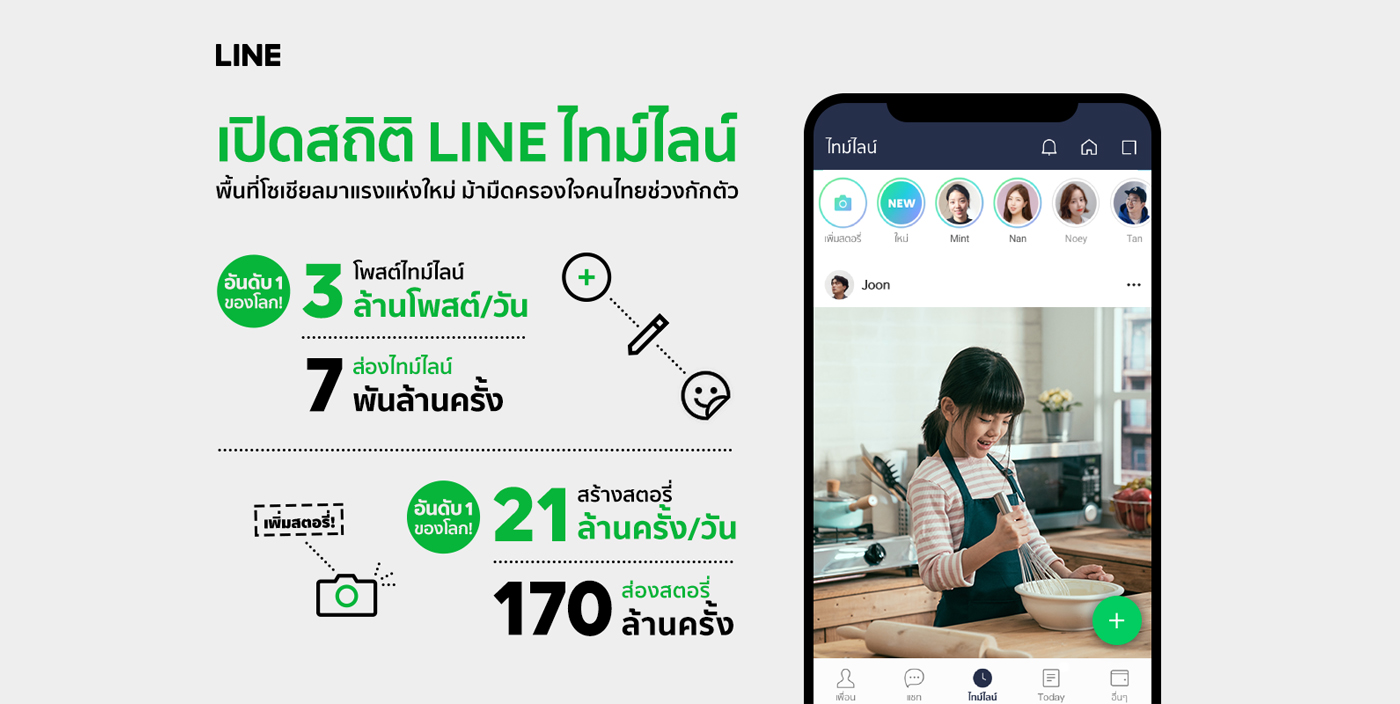 นอกจากนี้ ฟีเจอร์ Story ในหน้า LINE ไทม์ไลน์ ที่แม้จะปล่อยออกมาได้เพียง 1 ปี ก็สามารถสร้างปรากฎการณ์ฮิตติดลมบนครองใจคนไทยด้วยเช่นกัน ด้วยยอดการสร้างสตอรี่สูงที่สุดในโลกถึง 21 ล้านครั้งต่อวันในเดือนเมษายน* ซึ่งถือว่ามีการเติบโตสูงขึ้นจากตอนต้นปีถึง 38%