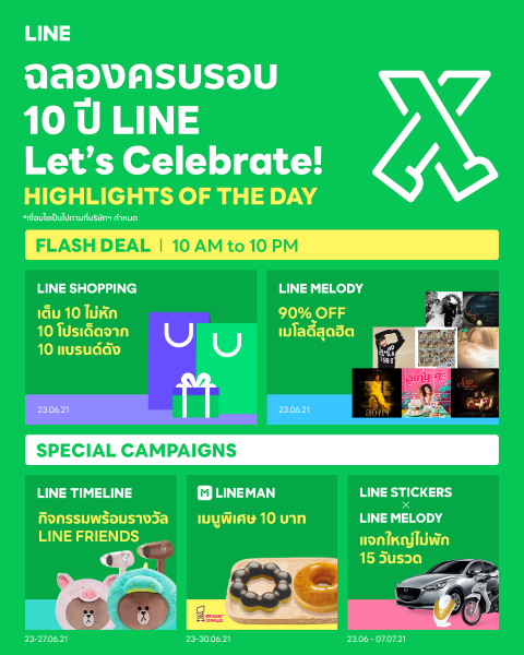 LINE ฉลองครบรอบ 10 ปีกับการเป็นแพลตฟอร์มเพื่อชีวิตยุคดิจิทัล ส่งพาเหรดกิจกรรมและโปรโมชันสุดฮอตแห่งปีที่ไม่ได้มีกันบ่อยๆ ชวนผู้ใช้ LINE หยิบมือถือเตรียมคว้าดีลแห่งปีที่ต้องห้ามพลาด ที่คราวนี้มาพร้อมกับ 4 โปรโมชันกับอีก 1 กิจกรรม จาก 5 บริการยอดฮิตของ LINE ทั้ง LINE STICKERS, LINE MELODY, LINE SHOPPING, LINE MAN และ LINE TIMELINE พร้อมลุ้นรางวัลรวมมูลค่ากว่าล้านบาท เริ่ม 23 มิ.ย. นี้