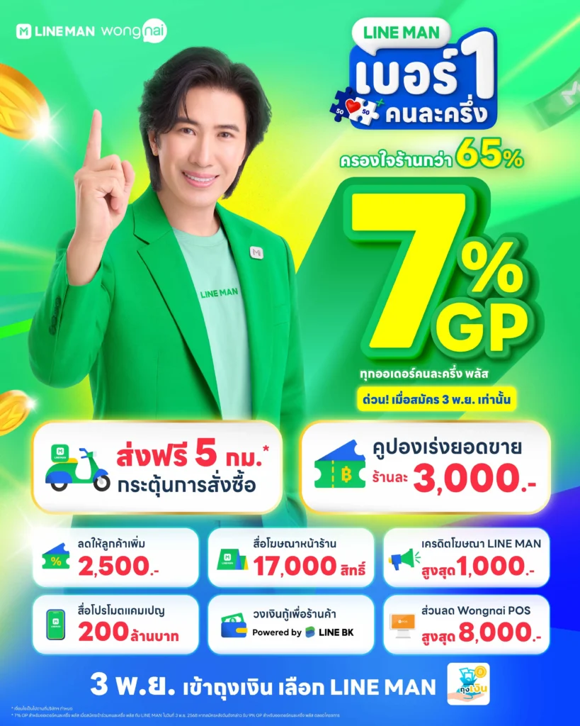 - รับ 7% GP สำหรับออเดอร์คนละครึ่งพลัส เมื่อสมัครเข้าร่วมโครงการกับ LINE MAN ในวันที่ 3 พฤศจิกายน 2568 หรือรับ 9% GP สำหรับออเดอร์คนละครึ่งพลัส ที่สมัครเข้าร่วมโครงการหลังวันดังกล่าวจนจบโครงการ
