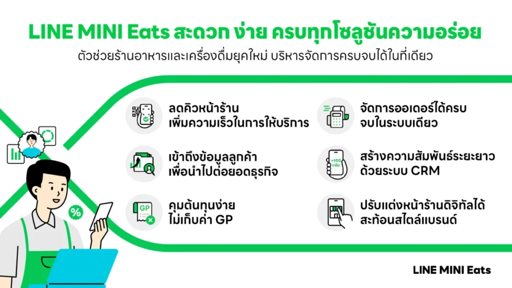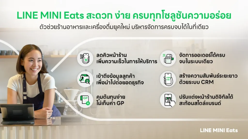 พร้อมระบบช่วยจัดการแบบครบจบ ครอบคลุมตั้งแต่รับออเดอร์ ชำระเงิน ไปจนถึงสร้างความสัมพันธ์มัดใจลูกค้าได้ ตอบโจทย์ช่วงเวลาเร่งด่วนให้ร้านค้าจัดการได้ไว เพิ่มศักยภาพในการแข่งขันให้ธุรกิจร้านอาหารและเครื่องดื่ม วิดีโอแนะนำ LINE MINI Eats: https://www.youtube.com/watch?v=GiONDCGZciU