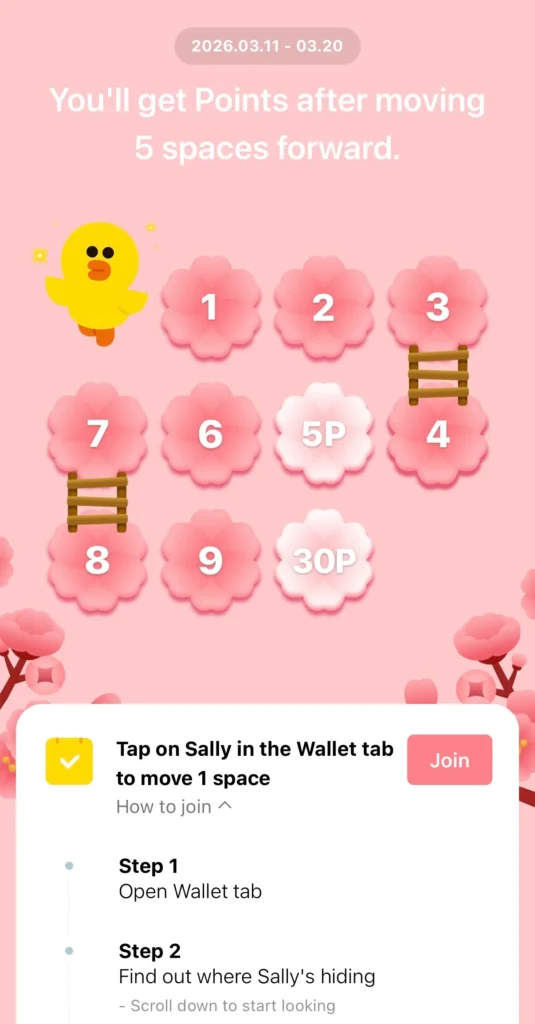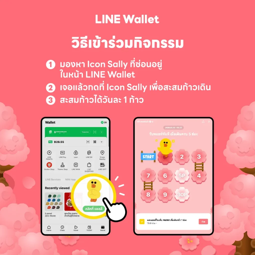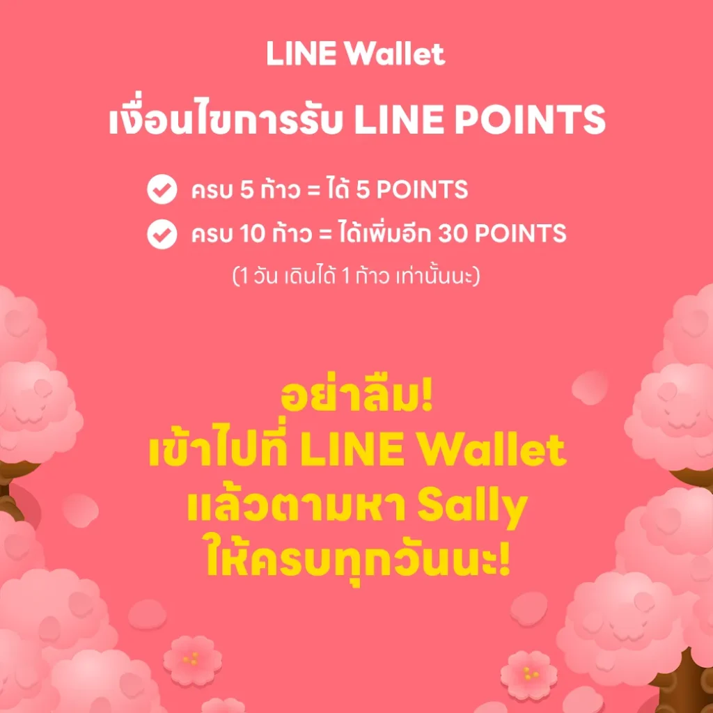 มาร่วมสนุก 10 วันเต็ม กับภารกิจตามหาแซลลี่: ต้อนรับซากุระบาน ฤดูกาลรับพอยท์ ตั้งแต่วันที่ 11–20 มีนาคม 2569 ผู้ใช้งานสามารถเข้าร่วมผจญภัยเพื่อตามหา Sally ในแท็บ Wallet ต่อเนื่องได้ทุกวัน เพื่อรับรางวัลรวมสูงสุด 35 LINE POINTS เพียงทำตามขั้นตอน ดังนี้