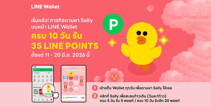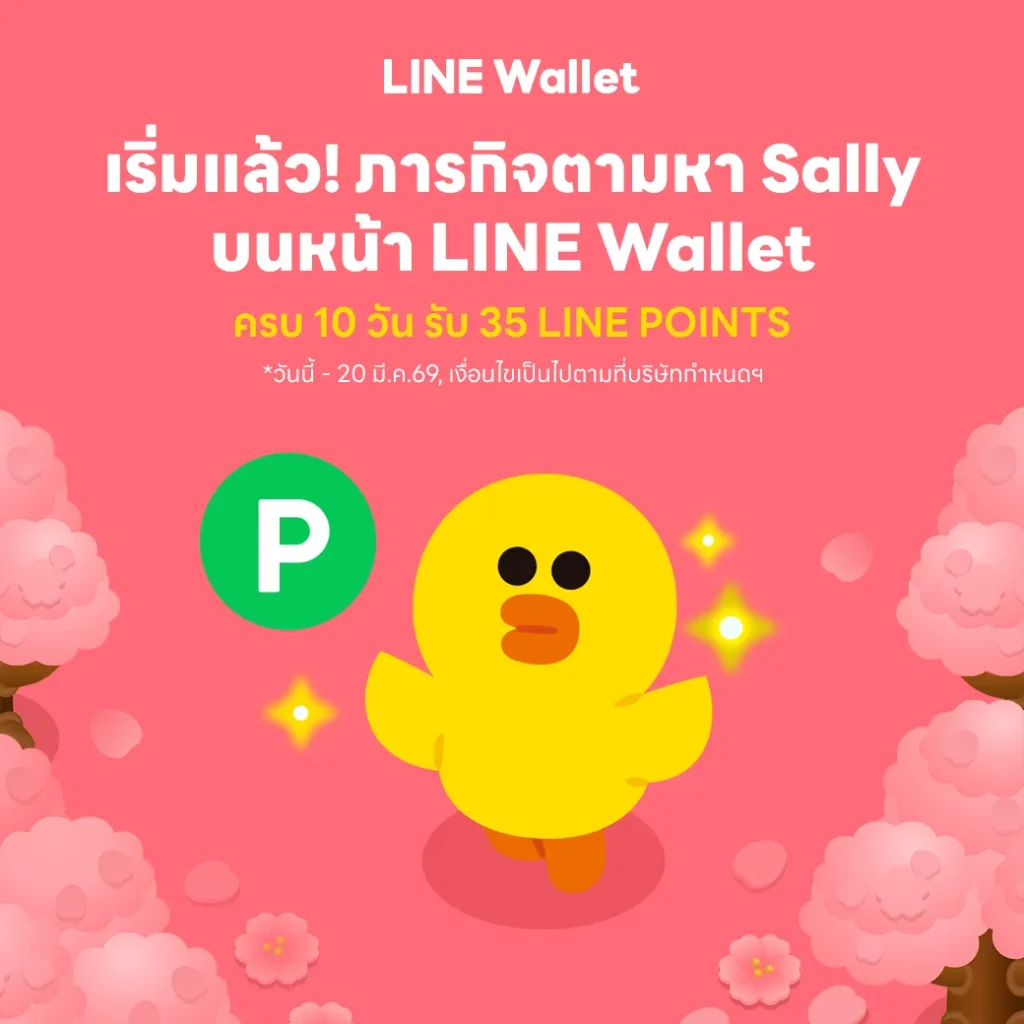 LINE Wallet ต่อยอดความสำเร็จจากแคมเปญยอดนิยม “ภารกิจตามหาแซลลี่: ต้อนรับซากุระบาน ฤดูกาลรับพอยท์” ชวนผู้ใช้งานร่วมสนุกกับธีมใหม่ “ซากุระ” ที่จะพาทุกคนออกเดินทางไปพร้อมกับ Sally ในสวนซากุระที่กำลังผลิบานสุดคิ้วท์ ผ่านกิจกรรมเช็กอินตามหา Sally บน LINE Wallet ทุกวัน ระหว่างวันที่ 11–20 มีนาคม 2569 ระยะเวลา 10 วันเต็ม เพื่อรับรางวัลสูงสุด 35 LINE POINTS!