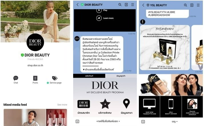 3) DIOR Beauty กับจุดเด่นการออกแบบ LINE OA ให้เป็นหน้าร้านออนไลน์ได้อย่างครบครัน มีการแนะนำเซ็ตผลิตภัณฑ์ใหม่ โปรโมชั่น แคมเปญพิเศษ เชื่อมต่อสู่หน้าจำหน่ายสินค้า เพียงแค่กดเลือกสินค้าลงตะกร้าพร้อมชำระเงิน ก็รอรับที่บ้านได้เลย! ทำให้การหาข้อมูลทุกผลิตภัณฑ์เป็นเรื่องง่าย แถมให้ความสำคัญกับทุกคำถาม ข้อสงสัย มีแชตบอทคอยช่วยตอบคำถามเบื้องต้น พร้อมพนักงานตัวจริงคอยให้คำปรึกษา คำแนะนำด้านความงามผ่านแชท พูดคุยดั่งเพื่อนสนิทที่รู้ใจ และหากใครเป็นแฟนพันธุ์แท้ สมาชิกของ DIOR Beauty ยังสามารถใช้ LINE OA นี้เพื่อรับบริการสุดเอ็กซ์คลูซีพเฉพาะสมาชิกได้อีกด้วย อย่าช้า! รีบแอดเฟรนด์ LINE: @diorthailand กันเลย