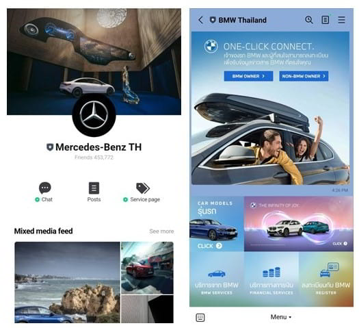 8) BMW Thailand อีกหนึ่งแบรนด์ที่ทำให้เราสนุกกับการเข้าโชว์รูมรถแบบออนไลน์ ง่ายแสนง่ายผ่าน LINE OA ผู้ใช้จะสามารถเห็นรุ่นรถทุกรุ่นของ BMW และกดคลิกเข้าไปอ่านรายละเอียดของแต่ละโมเดลได้ทันที โดยมีการเชื่อมต่อข้อมูลกันเพื่อให้ลูกค้าใช้งานได้ง่าย มีแม้กระทั่งตารางราคาที่กางให้เห็นอย่างละเอียดของรถทุกรุ่น และที่ถือว่าสุดยอดคือ เมนูบริการทางการเงิน ที่จะช่วยคำนวณค่างวดและวางแผนทางการเงินให้ผู้ที่สนใจ มีให้หมดครบทุกอย่าง โดยไม่ต้องถามคำถามใดๆ เพิ่มเติม มาแอดเฟรนด์เพื่อดูข้อมูลรถยนต์หรูแบรนด์นี้กันได้ที่ LINE: @bmwthailand