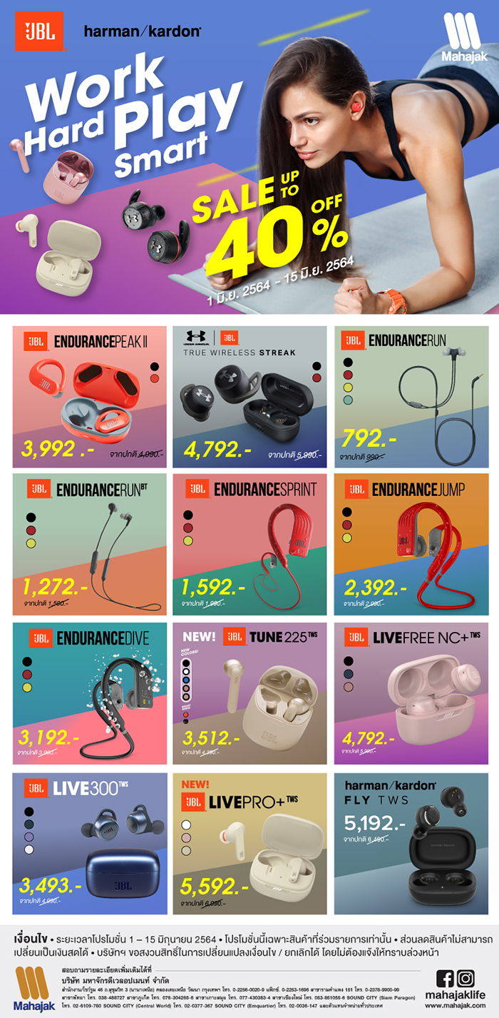 บริษัท มหาจักรดีเวลอปเมนท์ จำกัด จัดโปรโมชั่น WORK HARD PLAY SMART สินค้าหูฟัง True Wireless และหูฟัง Sport รุ่นยอดฮิตทั้ง JBL และ HARMAN KARDON ลดราคาสูงสุด 40%
