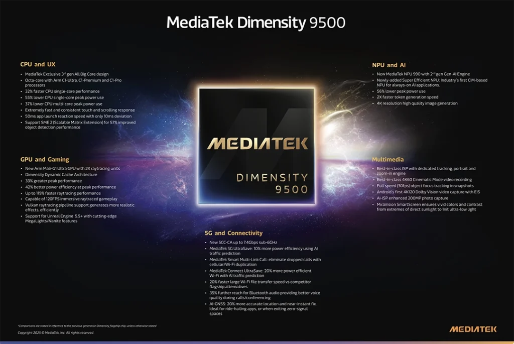 MediaTek Dimensity 9500 ใช้สถาปัตยกรรมซีพียู All Big Core เจเนอเรชันที่ 3 ประกอบด้วย Ultra Core ความเร็ว 4.21GHz Premium core 3 คอร์ และ Performance core 4 คอร์ พร้อมด้วยสตอเรจ UFS 4.1 แบบ Four Lane