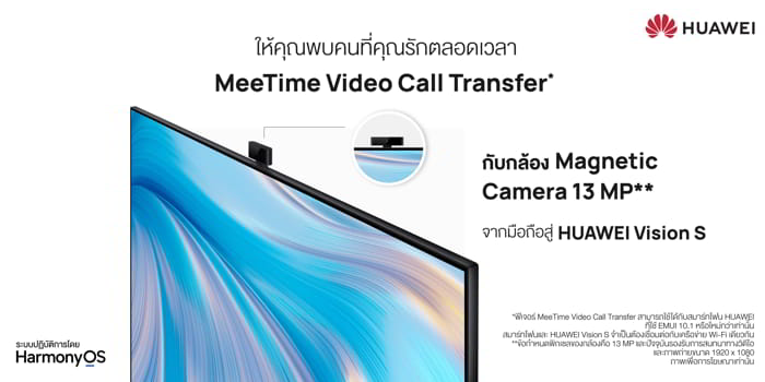 HUAWEI Vision S มาพร้อมกับรูปลักษณ์อันโดดเด่นของหน้าจอบางเฉียบและไร้ขอบ มีให้เลือกทั้งขนาด 55 นิ้ว และขนาด 65 นิ้ว อัดแน่นด้วยนวัตกรรมล้ำสมัยมากมายที่สามารถตอบสนองการใช้งานได้หลากหลายรูปแบบทั้งในด้านความบันเทิง การทำงาน และการเสริมสร้างความสัมพันธ์ระหว่างเพื่อนและคนในครอบครัวให้แน่นแฟ้นยิ่งขึ้น ด้วยกล้อง Magnetic Camera 13MP ที่ให้ผู้ใช้งานสนทนาผ่าน MeeTime Video Call ได้แบบเต็มตาบนหน้าจอที่คมชัดระดับ 4K