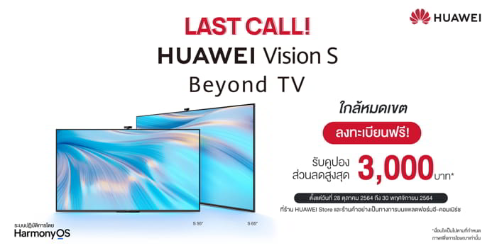 ความพิเศษยังไม่หมดเพียงเท่านั้น เพื่อเป็นการต้อนรับ Beyond TV เข้าสู่ตลาดประเทศไทยเป็นครั้งแรก หัวเว่ยจัดให้แบบไม่มีกั๊กสำหรับผู้ที่สนใจอยากจับจอง HUAWEI Vision S กับโอกาสสุดท้ายที่จะได้รับคูปองส่วนลดพิเศษมูลค่าสูงสุดถึง 3,000 บาท โดยสามารถลงทะเบียนรับคูปองได้ที่นี่ จนถึงวันที่ 30 พฤศจิกายน 2564 นี้เท่านั้น