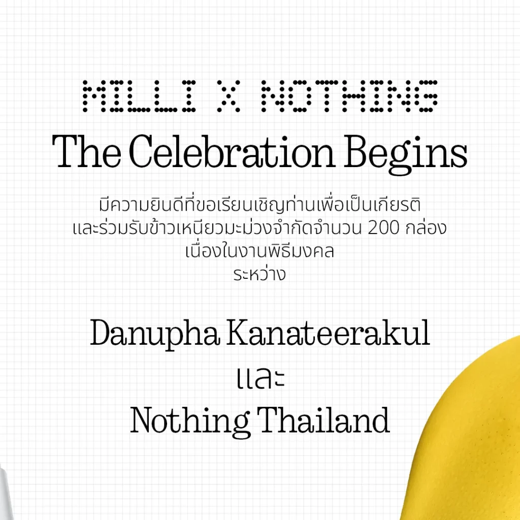 ล่าสุด Nothing Thailand ไม่ปล่อยให้รอนาน เดินหน้าจัดงานอีเวนต์ “MILLI meets Nothing: The Celebration Begins” ให้กับการ Say No (thing) ของ MILLI อย่างเป็นทางการ และนับเป็นการเปิดตัวความร่วมมือครั้งแรกระหว่างศิลปิน และแบรนด์พร้อมกับการเปิดขาย “Headphone (a) Yellow Edition” พร้อมโปรโมชันสุดพิเศษ