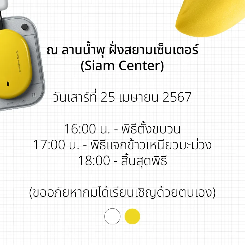 โดย Siam Center จะถูกเนรมิตพื้นที่ให้กลายเป็นแลนด์มาร์กสีเหลืองแห่งการเฉลิมฉลองแบบสมฐานะ พร้อมเพิ่มความป่วนด้วยการยก ร้านเจ๊เตียง ข้าวเหนียวมะม่วงชื่อดัง มาไว้กลางงาน