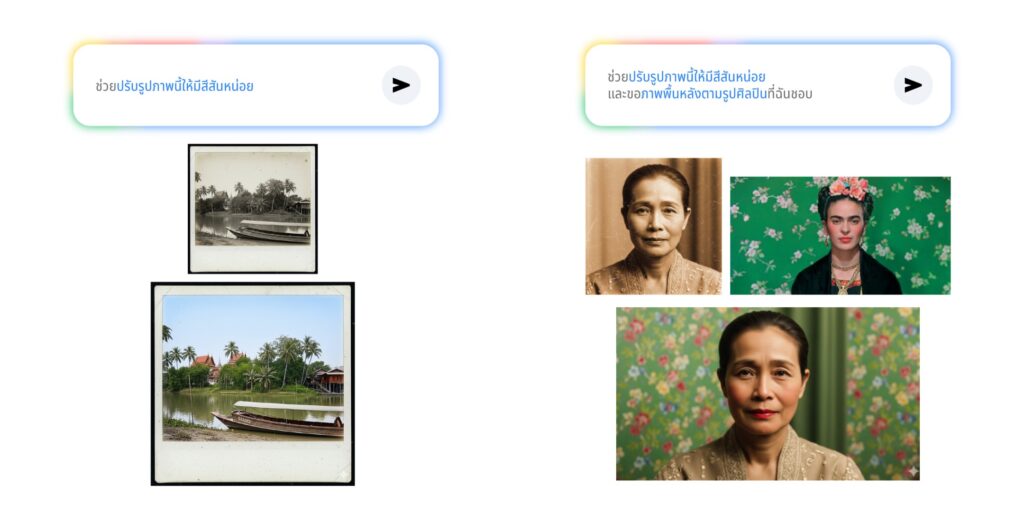 - อัปโหลดภาพถ่ายเก่าๆ หรือภาพขาวดํา “ช่วยปรับรูปภาพนี้ให้มีสีสันขึ้นแบบยุคปัจจุบันหน่อย” หรือ “ช่วยปรับรูปภาพนี้ให้มีสีสันหน่อยและขอภาพพื้นหลังตามรูปศิลปินที่ฉันชอบ”