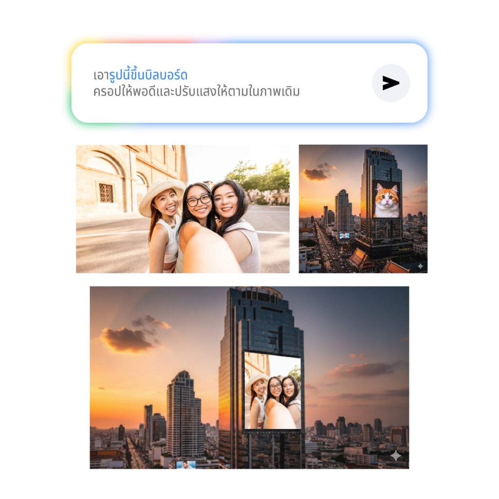 เพียงอัปโหลดภาพสินค้าที่คุณต้องการโฆษณาและภาพของสถานที่ที่จะติดตั้งโฆษณา Nano Banana จะประมวลผลและนำภาพโฆษณาของคุณไปวางในสถานที่จริงได้อย่างแนบเนียนและดูสมจริง โดยที่คุณไม่ต้องเสียเวลาออกแบบหรือปรับแต่งเองเลย ม็อกอัพที่ได้จะช่วยให้คุณและทีมเห็นภาพรวมของแคมเปญและสามารถตัดสินใจได้อย่างมั่นใจมากขึ้น