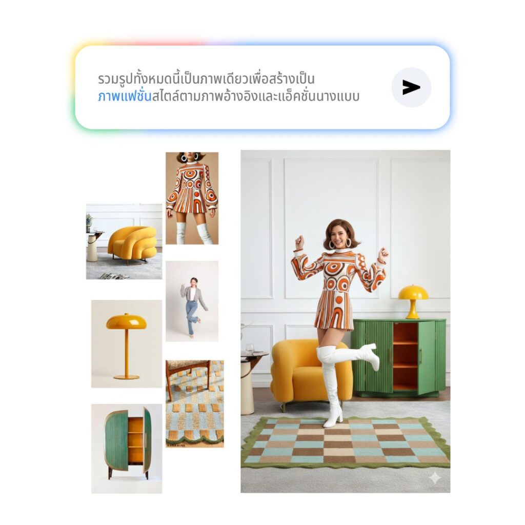 - เลือก ‘🍌 Image’ และใส่พรอมต์ “รวมรูปทั้งหมดนี้เป็นภาพเดียวเพื่อสร้างเป็นภาพแฟชั่นสไตล์ตามภาพอ้างอิงและแอ็คชั่นนางแบบ”