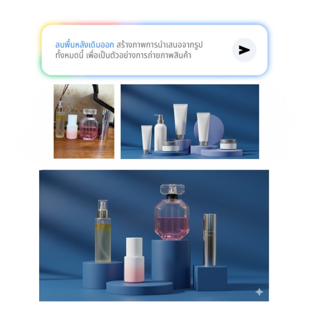 - เลือก ‘🍌 Image’ และใส่พรอมต์ เช่น “ลบพื้นหลังเดิมออก สร้างภาพการนำเสนอจากรูปทั้งหมดนี้ เพื่อเป็นตัวอย่างการถ่ายภาพสินค้า” หรือสามารถบอก Gemini ให้เพิ่มองค์ประกอบอย่างดอกไม้และหยดน้ำเข้าไป