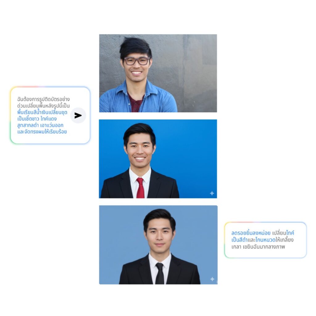 เพียงนำรูปถ่ายเซลฟี่หน้าตรงของคุณมาให้ Nano Banana ช่วยปรับแต่งให้ ไม่ว่าจะเป็นการเปลี่ยนชุดลำลองให้เป็นชุดสูทผูกเนกไท ปรับเปลี่ยนทรงผมให้ดูเรียบร้อย หรือเปลี่ยนกำแพงบ้านให้เป็นพื้นหลังสีขาวหรือสีฟ้าที่ดูสุภาพ ก็สามารถทำได้อย่างรวดเร็วและง่ายดาย